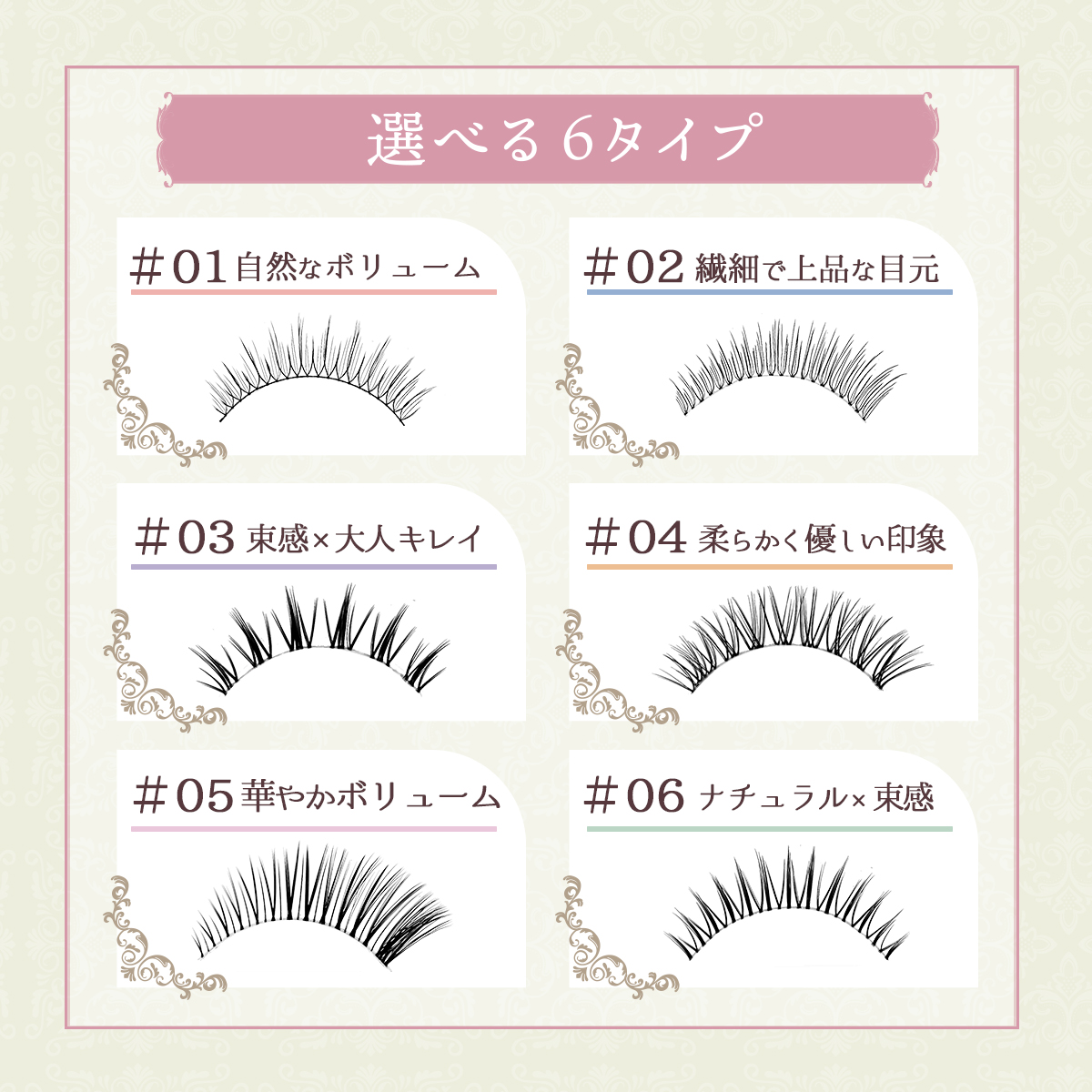 フルタイプでしっかり盛れて、まつエク風の自然な仕上がり。ぱっちり目元で自信が持てる垢抜けフェイスに!軽やかな付け心地で長時間でも快適、高密着で外れにくいからデイリー使いにも◎。低刺激素材使用で敏感な目元にも優しく、メイク初心者から上級者まで幅広く使えます。プチプラなのに高見えするコスパの良さも魅力。選べる6種のバリエーションで、なりたい印象にぴったりフィット♪